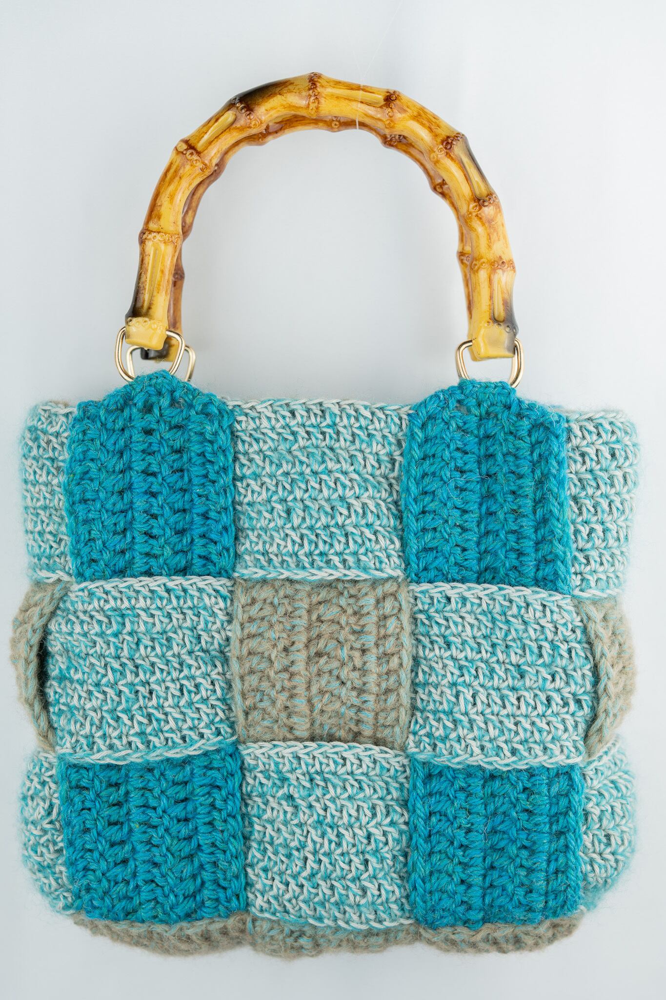 チェッカードシリーズは一つ一つのパーツを手編みした後、パーツ同士を織り、内側を縫い合わせてできております。